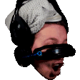 Dailysage with headphones and glasses, making an exaggerated 'Pogchamp' expression while spinning.
