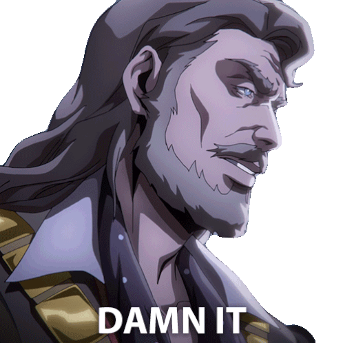 Saint Germain from Castlevania expresses frustration with a 'Damn It' caption. The animated character is seen with a beard and long hair.