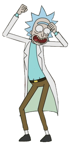 Rick Sanchez from Rick and Morty makes a frantic, dancing gesture, hands on head, mouth open in surprise or excitement.