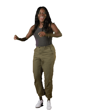 A joyful woman with long dark hair dances energetically, smiling brightly and moving her arms and legs with enthusiasm.