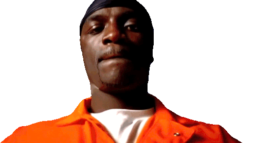 Akon, wearing an orange shirt and black headband, performs his iconic dance moves, raising his arms in a grooving motion.