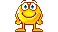 A pixelated yellow smiley face with blue eyes and glasses joyfully dances, expressing happiness and celebration.