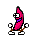 A happy, pixelated banana character with arms and legs dances joyfully, featuring a red mouth and green limbs.