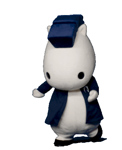 A cute white mascot wearing a blue jacket and hat dances energetically, grooving with excitement.