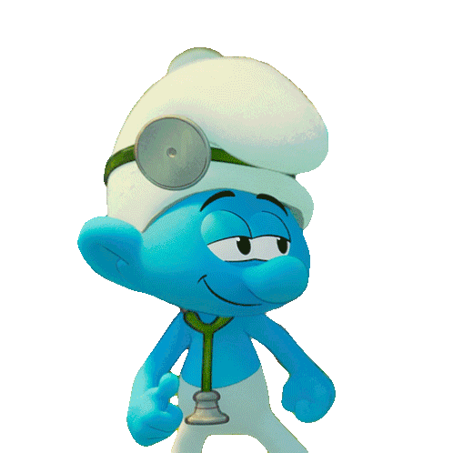 Doctor Smurf dances happily, wearing a stethoscope and a head mirror, a character from the Smurfs movie.