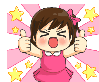 A cute animated chibi girl transitions from a shy smile to an enthusiastic thumbs-up with stars, expressing happiness and approval.