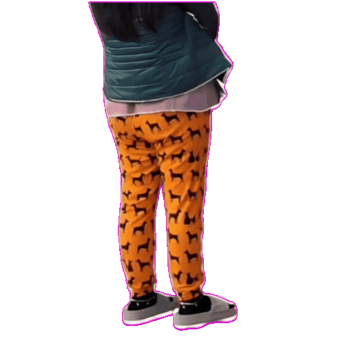 a person wearing a pair of orange pants with a pattern of cats on them