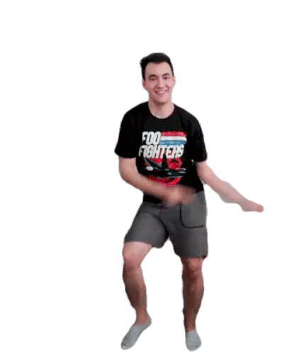 Man in a black Foo Fighters shirt and shorts doing a lively dance, moving his arms and legs energetically.