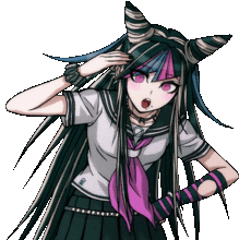 a girl with long hair and horns is wearing a school uniform and a pink tie