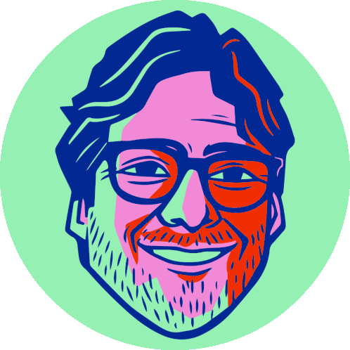 a colorful drawing of a man with glasses and a beard smiling