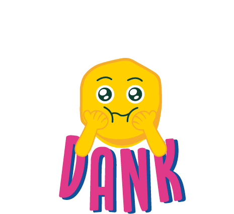 A happy yellow emoji with thumbs up and the word 'DANK' surrounded by colorful 'TINGE' drink bottles and stars.