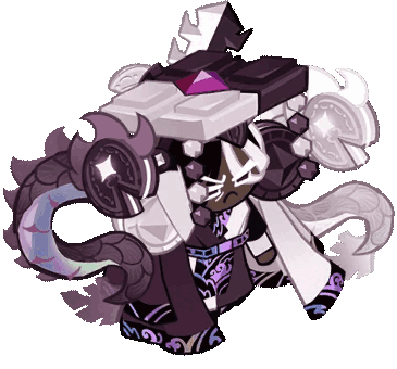 Dark Cacao Cookie from Cookie Run Kingdom, a regal character with a purple tail and a distinctive hat, stands animated.