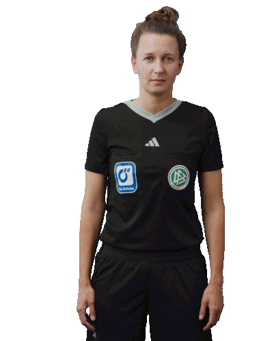 a woman wearing a black adidas shirt with a blue g on the front