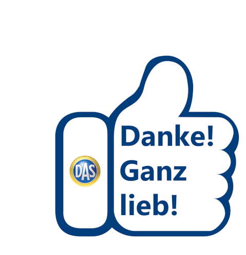 A blue thumbs-up gesture with 'Danke! Ganz lieb!' text and a 'DAS' logo, expressing thanks and kindness.