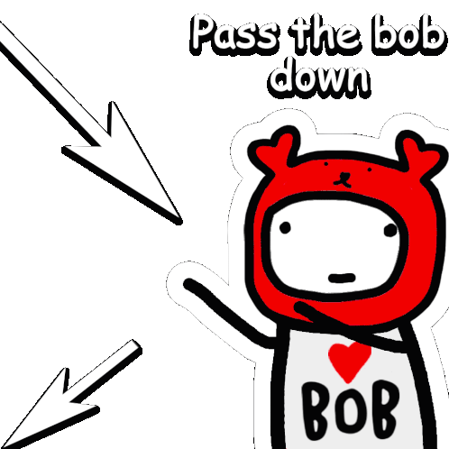 A red-hooded Datboi character holds a 'BOB' sign, with text 'Pass the bob down' and arrows pointing to it.