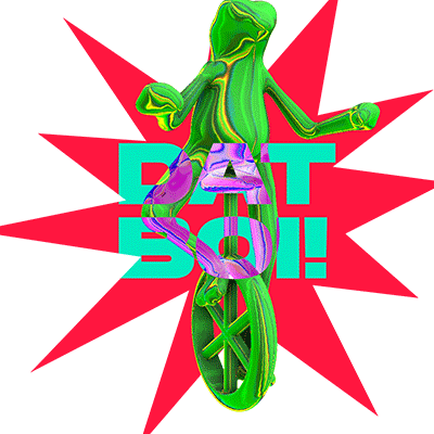 a green lizard is riding a bicycle with the words fat boy written in the background