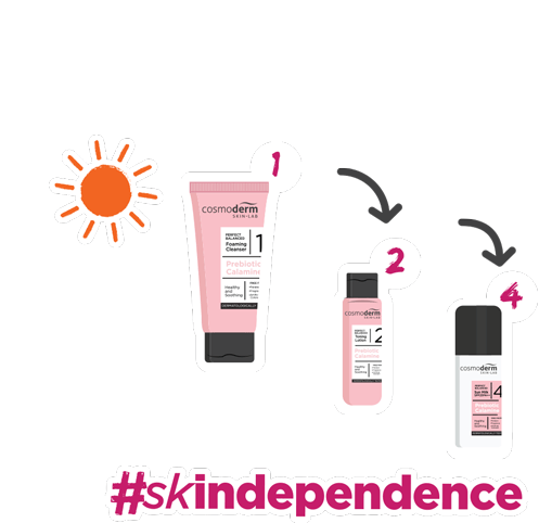 Animated sticker showing the Cosmoderm Prebiotic skincare day regime, featuring cleanser, toning lotion, and moisturizer steps.