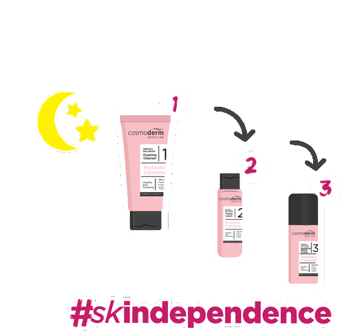 Animated sticker showing a three-step Cosmoderm Prebiotic night skincare routine with cleanser, toner, and serum, marked 1, 2, 3, under a moon and stars.