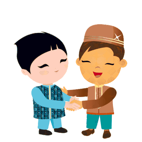 a cartoon illustration of two boys shaking hands with a speech bubble that says eid mubarak