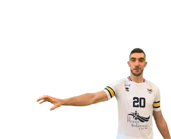 Volleyball player De Leon in action, hitting a ball, pointing, and smiling. An energetic sticker for sports fans.