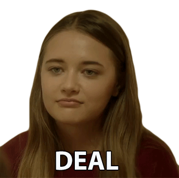 Reylynn Caster gives a knowing smirk, agreeing to a deal with the word 'DEAL' displayed.
