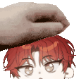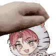 a hand is putting something on the head of a cartoon character .