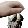 Dedusmuln from Hylics, created by Mason Lindroth, receives a gentle pet from a hand holding coins.