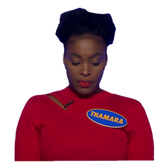 Thamara from Family Feud Canada takes a deep breath, concentrating during the game show.