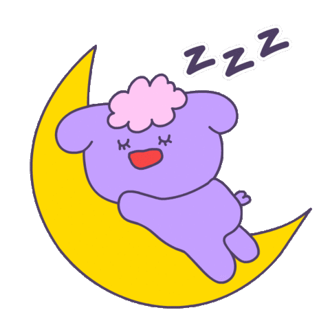 A cute purple cartoon character with pink fluffy hair sleeping soundly on a yellow crescent moon with 'Zzz' above its head.
