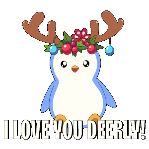 A cute penguin dressed as a reindeer with a festive wreath, sharing a punny 'I Love You Deerly!' message.