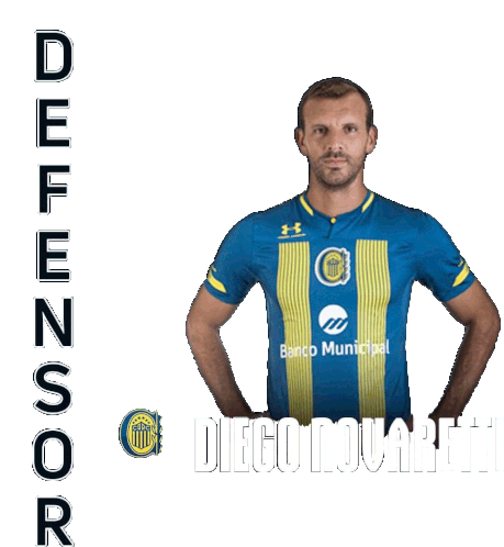 a man wearing a blue and yellow striped shirt with banco municipal on it