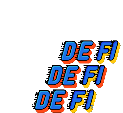 An animated sticker featuring the text "DEFI" in a vibrant blue, orange, and yellow color scheme with a speed effect, representing decentralized finance.