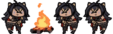 Dehya and her fellow Dehyas happily grooving around a warm campfire in a charming pixel art animation.