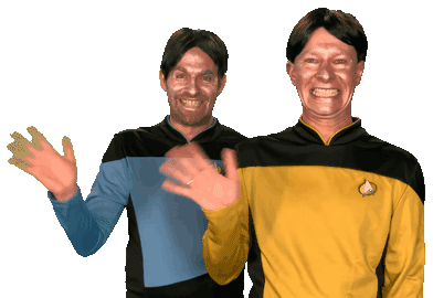 Two members of Deinefreunde, dressed in Star Trek-like uniforms, wave enthusiastically, greeting or saying goodbye.