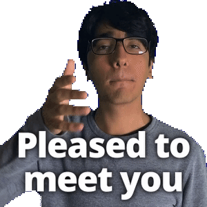 a man wearing glasses says pleased to meet you while pointing at the camera