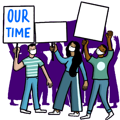 Protesters wearing masks hold signs reading 'Our Time Now For Our Health,' advocating for better healthcare and justice.