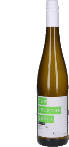 A close-up of a Derfrischegrüne Vanweins wine bottle, showcasing its label with details like 750ml and German text.