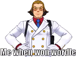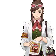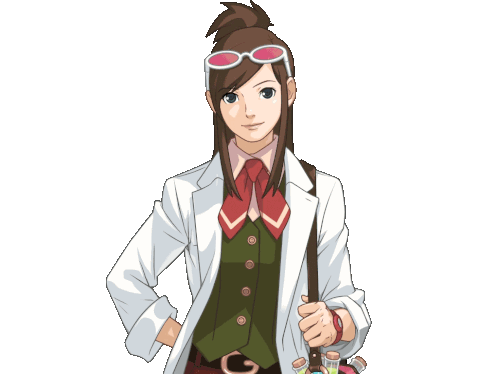 Ema Skye, the detective from Ace Attorney, in her lab coat, green vest, and red tie, with sunglasses on her head.