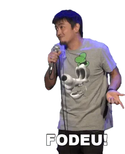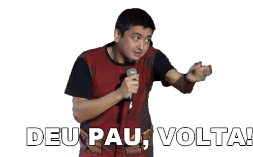 a man in a red shirt is holding a microphone and says " deu pau volta "