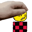 a hand is putting a yellow smiley face on top of a checkered shirt .