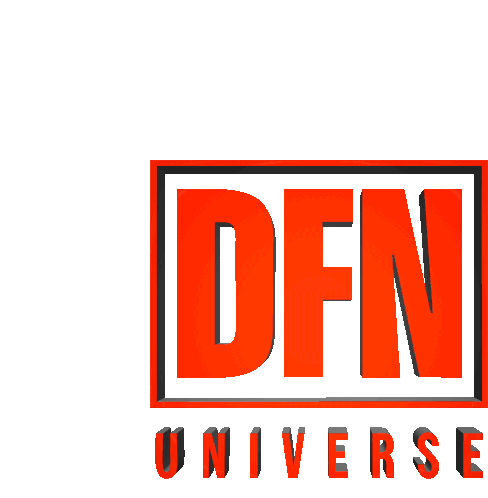 A dynamic 3D animation revealing the DFN Universe logo with red and grey letters rotating into view.