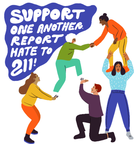 An illustration of diverse people supporting each other, promoting the message 'Support One Another. Report Hate to 211!'