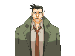 Dick Gumshoe, the detective from Ace Attorney, in a pixel art sticker, wearing his signature trench coat and tie.