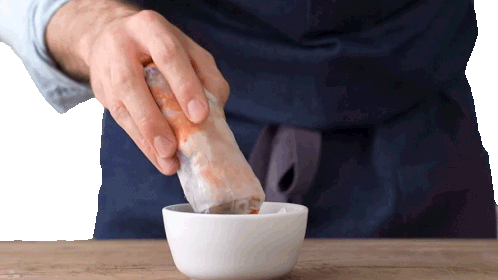 Brian Lagerstrom's hand, wearing an apron, dips a fresh spring roll into a white bowl of delicious sauce.