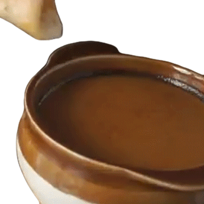 A piece of food, possibly a bread roll, is dipped into a rich brown sauce in a ceramic bowl. From Two Plaid Aprons.