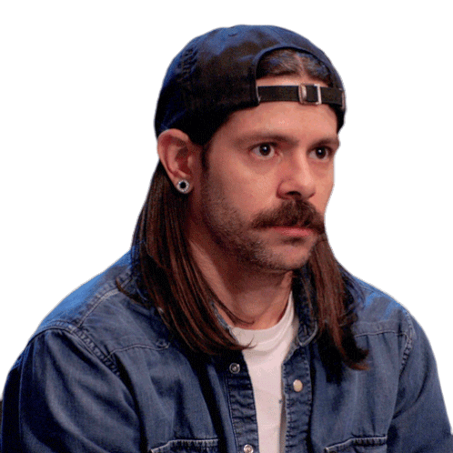 a man with long hair and a mustache wearing a baseball cap and a denim shirt