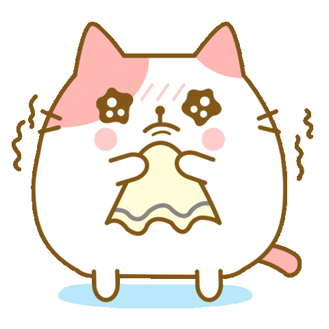 A chubby cartoon cat with pink ears and brown spots is crying profusely, with large tears streaming down its face and its mouth open in a wail.
