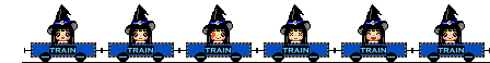 A pixel art train carrying witches, designed as an animated divider sticker.