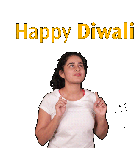 A young woman celebrates Diwali, pointing upwards with "Happy Diwali" and "Be A Fitakha" text, embodying the festive spirit.