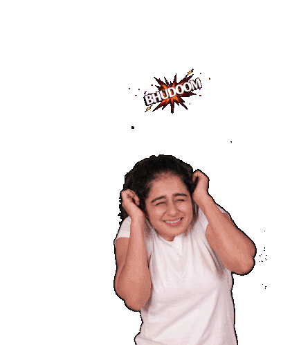 A young woman reacts with a playful smile to a loud 'BHUDOOM' explosion, symbolizing a Diwali firecracker.